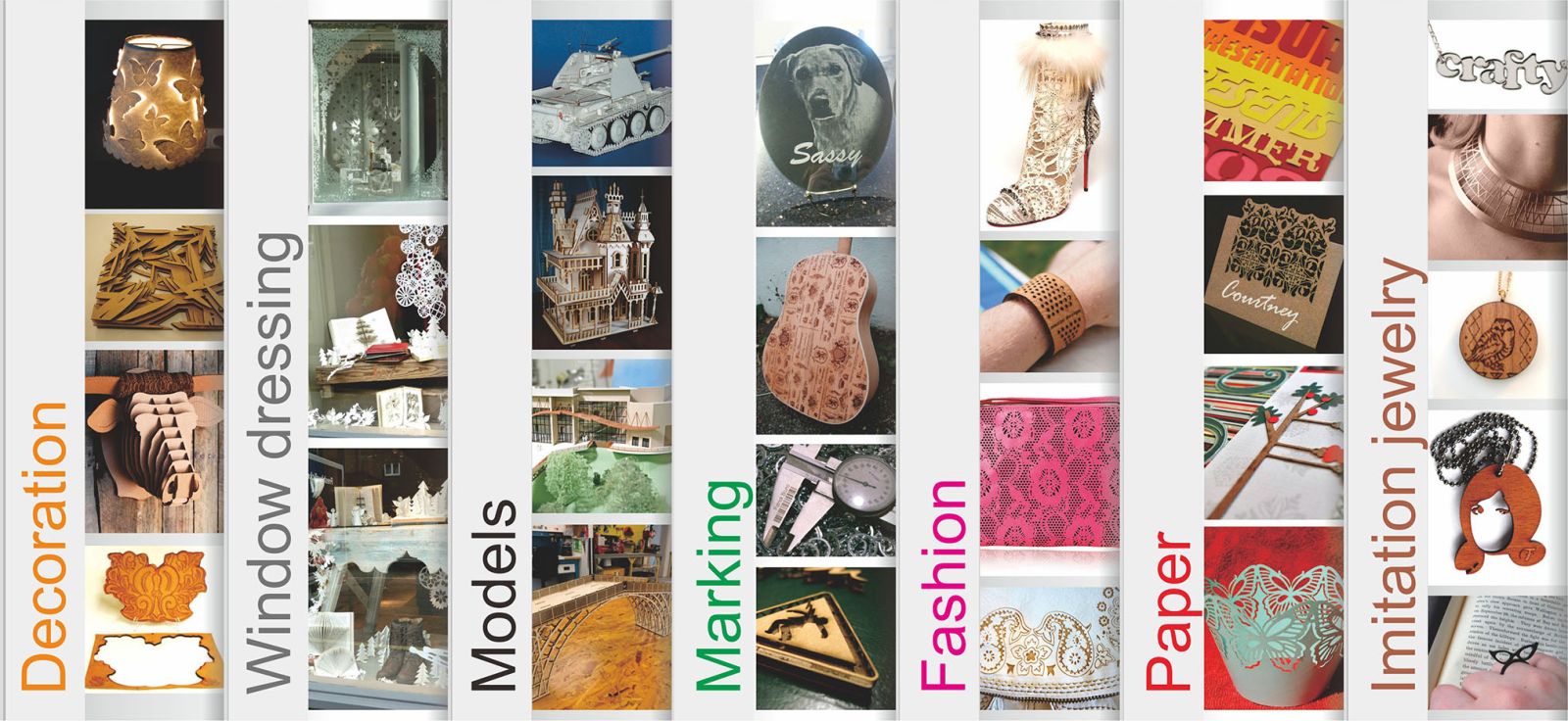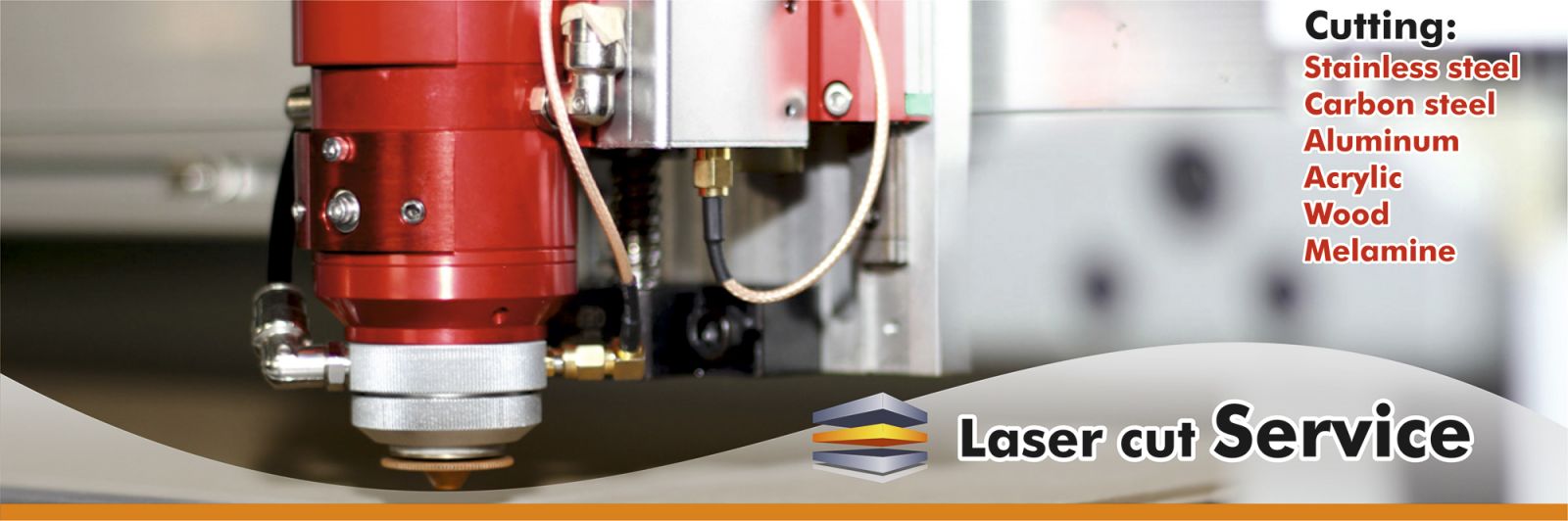 Laser cut stainless steel, laser cut carbon steel, laser cut aluminum, laser cut acrylic, laser cut wood, laser cut melamin.